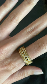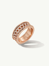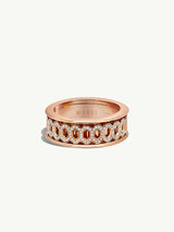 The Amanti Spinning Infinity Ring by New York jewelry designer Angie Marei is exquisitely handcrafted with great precision in 18-karat rose gold precious metal. This elegant design possesses an intricate pattern of brilliant pavé diamond geometric dimensional windows creating a glittering vignette that shines and reflects light from all angles.