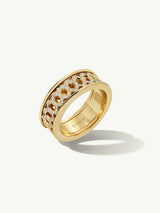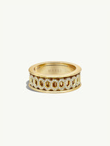 The Amanti Spinning Infinity Ring by New York jewelry designer Angie Marei is exquisitely handcrafted with great precision in luxurious 18-karat yellow gold precious metal. This elegant design possesses an intricate pattern of brilliant pavé diamond geometric dimensional windows creating a glittering vignette that shines and reflects light from all angles.