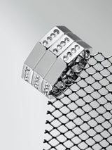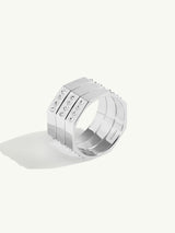 The Octavian Triptych Tower Ring by jewelry designer Angie Marei features an architectural and geometric design handcrafted in luxurious polished platinum metal, accented with burnish-set brilliant white diamonds adding fire and brilliance to this bold and unique piece.