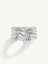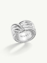 Strikingly elegant and statuesque, the Pharaoh I Pavé-Set Brilliant White Diamond Ring by Angie Marei is impeccably handcrafted from luxurious solid platinum. This original design features a smooth, sculptural, incised surface that seductively wraps around the entire piece. Sparkling white diamond-accented edges unveil unexpected brilliance, fire, and scintillation.