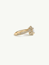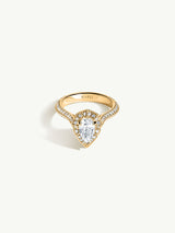 Derived from Hebrew origins, "Atara" embodies meanings of "crown" and "blessed." Drawing inspiration from the regal crowns of antiquity, Marei ingeniously crafted this piece with a geometric, three-dimensional halo of sparkling pavé diamonds. This intricate design elegantly encircles and highlights the exquisite pear-cut diamond center stone. Reflecting regal opulence, Atara's design emphasizes height and splendor, ensuring a truly unforgettable presence.