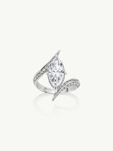 The Ayla Arabesque Engagement Ring by Angie Marei is a timeless piece that is sure to enchant with its captivating ultra-feminine design that exudes sophistication. This unique piece features a brilliant-cut marquise white diamond center stone embellished with pave-set glittering white diamonds and crafted from platinum. A perfect symbol of your eternal love.