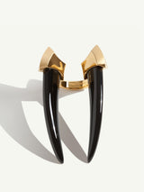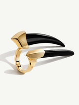 The Damian Black Onyx Horn Talisman Ring by Angie Marei features two hand-carved and polished black onyx horns mounted in a luxurious solid 18-karat yellow gold setting. With its salient features, the smooth onyx stones and gleaming gold create an evocative and unique silhouette taking inspiration from apotropaic talismans worn by the royal Ancient Egyptians. This monumental jewel is meant to be worn and proudly displayed with an air of confidence that will surely captivate and subdue your audience.