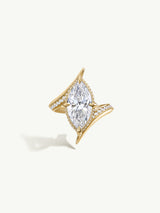 The Ayla Arabesque Engagement Ring by Angie Marei is a timeless masterpiece that captivates with its ultra-feminine design and sophisticated allure. At its center, a brilliant-cut marquise white diamond sparkles, flanked by half of the band adorned with pave-set white diamonds that enhance its brilliance. The band features a sleek knife-edge setting, adding a contemporary touch to the classic elegance. Crafted from 18-karat yellow gold, this ring beautifully symbolizes your eternal love.