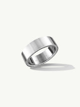 The Ignis Diamond Edge Accented Band by Angie Marei features an extra-wide 8mm band handcrafted in 18-karat white gold and two rows pavé set brilliant-cut white diamonds along the top and bottom edges of the band. The gorgeous sparkling white diamonds create an eye-catching scintillating effect of flashing spectral-colored sparkles.