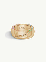 - Pavé-set brilliant-cut round natural white diamonds, an array of multi-colored natural sapphires and Tsavorite garnets on both sides of the ring