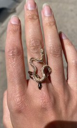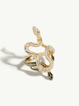 Inspired by the legendary allure and tragic end of Cleopatra, the Black Opium Hayya Pavé White Diamond Serpentine Ring I. by New York jeweler Angie Marei exude a dark, sultry glamour. Handcrafted as wearable works of art, each one-of-a-kind ring coils with serpentine grace, glittering with brilliant-cut white diamonds and inlaid with rich black enamel. Mysterious. Seductive. Unforgettable.