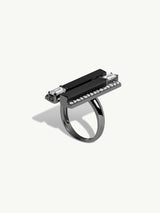The Invidia Black Onyx Column and White Diamond Ring by Angie Marei is masterfully handcrafted in opulent blackened 18-karat gold. This sculptural piece features striking columns of hand-carved and polished black onyx, flanked by step-cut baguette white diamonds and pavé-set brilliant-cut round white diamonds. Sleek, structured, and architecturally bold, this design draws inspiration from the refined elegance of the Art Deco era and the rich visual language of Ancient Egyptian art.