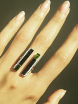 The Invidia Black Onyx and Blue Sapphire Column Ring by Angie Marei is a bold and sculptural statement piece, meticulously handcrafted in luminous 18-karat blackened gold. This captivating design features sleek columns of hand-carved and polished black onyx, accented with vibrant baguette-cut blue sapphires, and framed by brilliant pavé-set and straight baguette-cut white diamonds. Architecturally bodied and exquisitely balanced, the ring embodies the geometric precision and modern glamour of the Art Deco era, fused with the sacred artistry and symbolism of Ancient Egyptian jewelry.