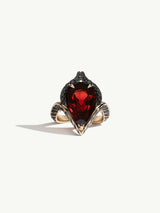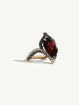 The Oceanna Ring is an imaginative and exotic Art Noveau-inspired jewel designed by Angie Marei that features a beautiful precision-cut, alluring Red Mozambique Garnet in 18-karat yellow gold and brilliant black diamonds mounting.