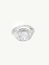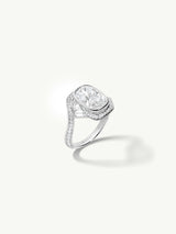 The Maat Engagement Ring by Angie Marei is a timeless masterpiece that epitomizes ultra-feminine elegance and sophistication. Set in platinum, this exquisite piece features a dazzling brilliant-cut cushion white diamond at its center, flanked by baguette diamonds reminiscent of the goddess’s feathers and pave-set white diamonds for an added touch of shimmering allure.