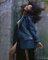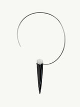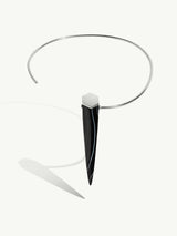 The Black Onyx Pendulum Sculptural Necklace by Angie Marei is daring in its unique, bold design inspired by ancient artifacts. Featuring a salient black onyx pendant, beautifully hand-carved, faceted, and polished from natural raw gemstone by highly skilled artisans. The hand-forged sterling silver neckpiece contours around the collar bone, suspending the black onyx talisman pendant.